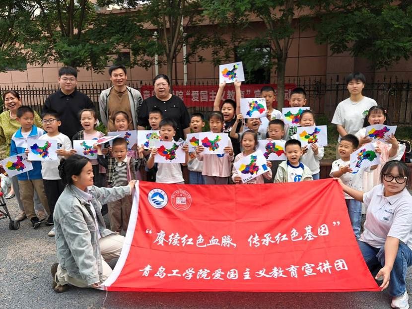 “祖国地图”环节则掀起了知识与热情的高潮。各小组面对中国行政区划空白图通力合作,用缤纷彩笔唤醒祖国版图的轮廓。随着“西藏有哪些世界文化遗产?”“山东在抗战中有哪些英雄城市?”等问答展开,宣讲团成员穿梭其间,讲述着神州大地每一方水土背后可歌可泣的奋斗故事。当一幅幅彩绘地图逐渐完整,主持人动情总结:“地图上的每一道色彩,都是先辈用热血守护的印记;每一寸山河,都承载着我们共同的文化根脉。珍惜它、守护它,就是守护我们最珍贵的家园!”真挚的话语点燃了孩子们眼中守护山河、报效祖国的光芒。