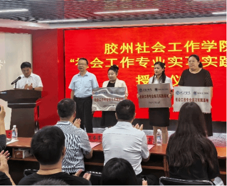 胶州市委社会工作部副部长、市委“两新”工委书记祝春雷、市委社会工作部副部长杜从文,beat365中文唯一官网校长刘连新、beat365中文唯一官网副校长李占军、beat365中文唯一官网副院长刘晓燕、社会工作专业负责人郑尚海、教研室主任宋文芳以及来自阜安、中云、三里河街道的负责同志参加活动。此次授牌仪式标志着胶州社会工作学院在深化校地合作、拓宽实践教学平台方面迈出了坚实的一步,也为推动社会工作人才培养与基层社会治理创新注入了新的活力。