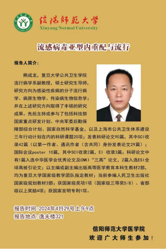 报告人简介:熊成龙,复旦大学公共卫生学院流行病学系副教授,硕士研究生导师,研究方向为感染性疾病的分子流行病学、病原生物学、传染病生物信息学;并在上述研究方向取得了丰硕的研究成果。先后主持或参与了包括科技部国家重点研发计划、中央军委后勤保障部综合计划、国家自然科学基金,以及上海市公共卫生体系建设三年行动计划在内的科研课题20项;发表科研论文90篇,其中SCI收录42篇(以第一作者、通讯作者(含共同)身份发表论文29篇);国际会议poster 10篇,其中SCI收录2篇,EI 收录3篇;科研论文中有1篇入选中华医学会优秀论文及CNKI“三高”论文,2篇入选ESI全球高被引论文;以主编或副主编出版高等医学教育本科生教材2部,均为复旦大学国家级教学团队指定教材;当前参编人民卫生出版社国家级规划教材3部;获国家级奖项1项(国家级三等奖5/8)、省部级以上奖励4项;获国家发明专利1项。