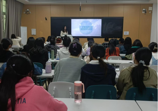 随后,张老师通过对近年来护理院校招录护理硕士研究生的数据分析,解读了当前严峻的考研形势,并结合自己的考研经历、经验积累及考研上岸同学的案例分析,就院校选择、专业方向、考试科目题型、考研分数线划定、考研信息来源网站、备考策略、调剂注意事项等内容作了详细讲解,提出了许多宝贵实用的意见和建议。讲座的最后,同学们纷纷向张老师提问,张老师就同学们的问题和困惑进行了的耐心解答和交流互动,整场讲座氛围活跃,反响热烈。