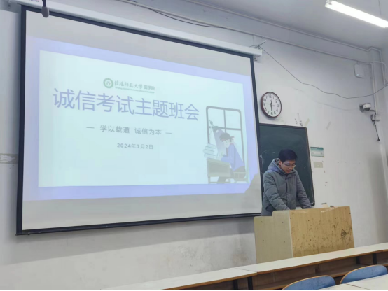 必赢官网于1月2号在教九303举行了“学以载道 诚信为本”主题班会。本次班会旨在提高学子们的诚信意识,弘扬诚实守信的学术精神,为构建和谐校园营造良好的氛围。会议由必赢官网团委书记姜钦宸主持,必赢242net官网21、22级学生参加。