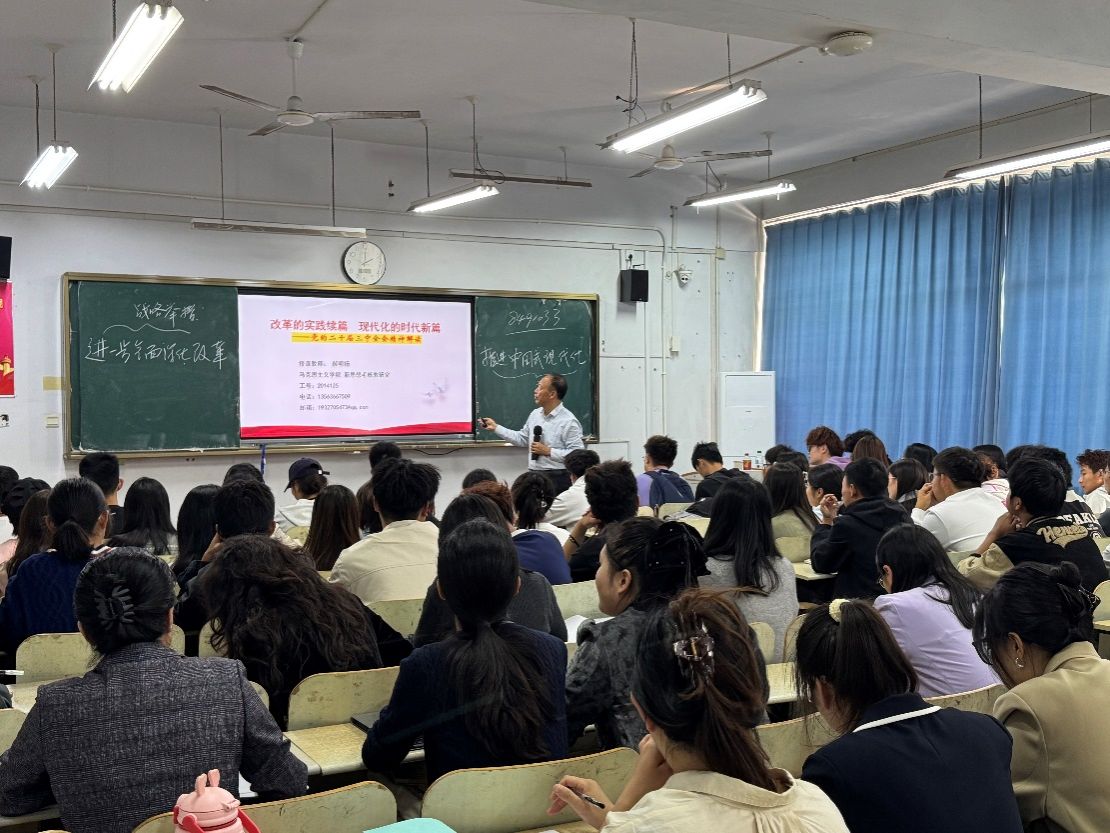 党的二十届三中全会,是在以中国式现代化全面推进强国建设、民族复兴历史伟业的关键时刻召开的重要会议。为深入学习宣传贯彻党的二十届三中全会精神,推动学院师生深刻认识进一步全面深化改革、推进中国式现代化的重要意义,10月16日下午,beat365中文唯一官网毛泽东思想和中国特色社会主义理论体系概论教研室、习近平新时代中国特色社会主义思想概论教研室、形势与政策教研室全体教师共同学习二十届三中全会精神专题课。郝明杨教授以“改革的实践续篇 现代化的时代新篇”为主题对党的二十届三中全会精神进行解读。