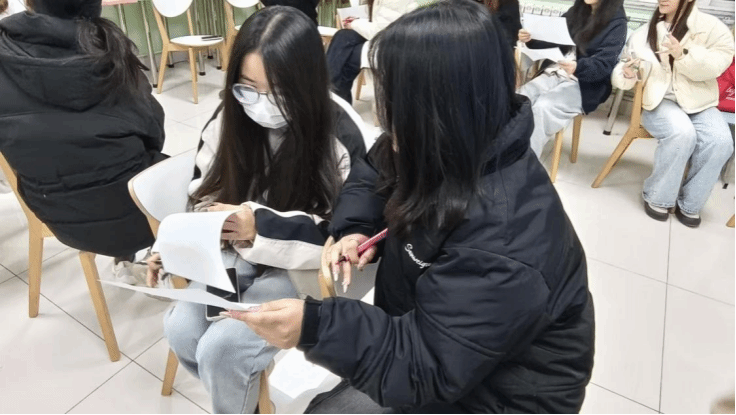 活动转入主题绘画环节,同学们被分为三组,围绕 “面具”“路障” 等与疏离相关的意象,开展 “传递者绘画 + 答题者猜词” 的互动游戏。分享环节中,3位同学结合小组完成的画作,细致阐释了自己对 “社交疏离” 的理解:有人认为 “面具” 象征着在社交中刻意隐藏真实自我的状态,有人则觉得 “路障” 对应着与人建立联结时遇到的心理阻碍。随着游戏的推进,各组同学间的交流逐渐增多,原本略显拘谨的氛围慢慢变得欢快起来,大家也在共同解读意象的过程中,更清晰地认识了疏离情绪,学会坦然面对生活中那些感到疏离的时刻。