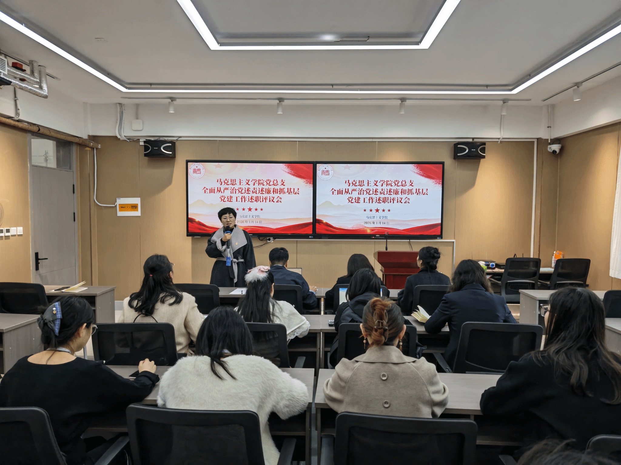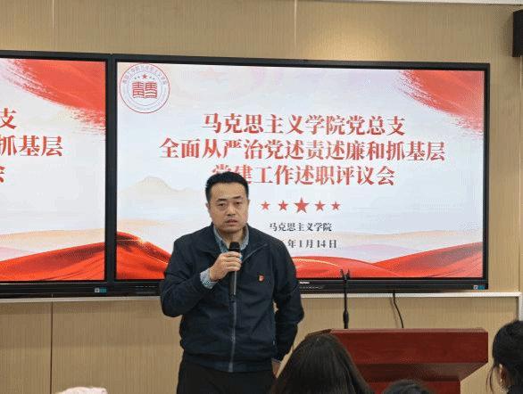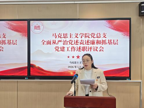 为深入贯彻落实新时代党的建设总要求,压实管党治党政治责任,全面检验基层党组织工作成效,1月14日,beat365中文唯一官网党总支召开2025年度全面从严治党述责述廉和抓基层党建工作述职评议会。学院思政党支部书记姜文文、社工联合党支部书记刘蕾分别进行现场述职。会议由党总支副书记付国花主持,学院党总支书记周晓东,副院长刘晓燕、宋文芳及全体党总支委员出席会议。