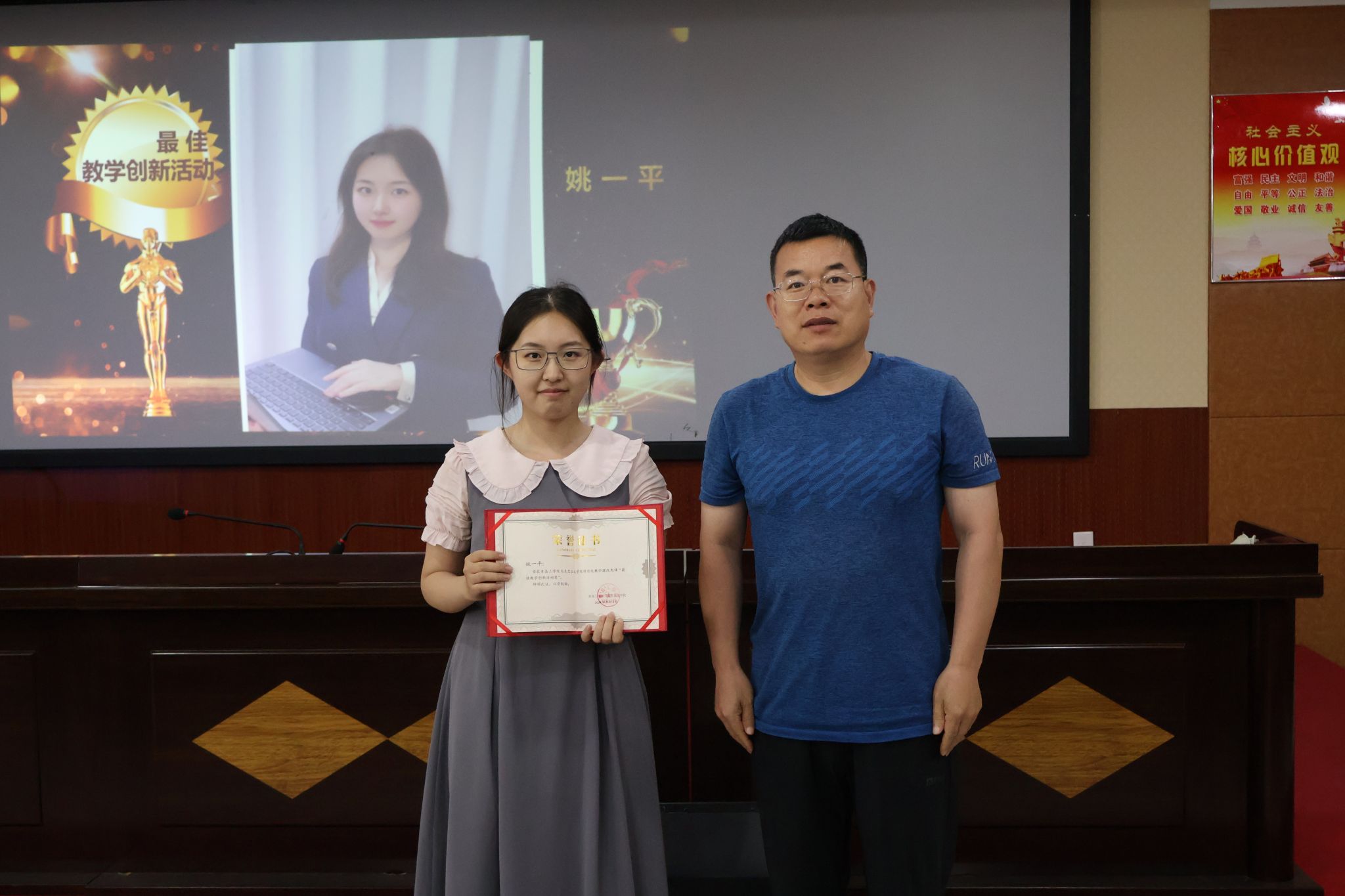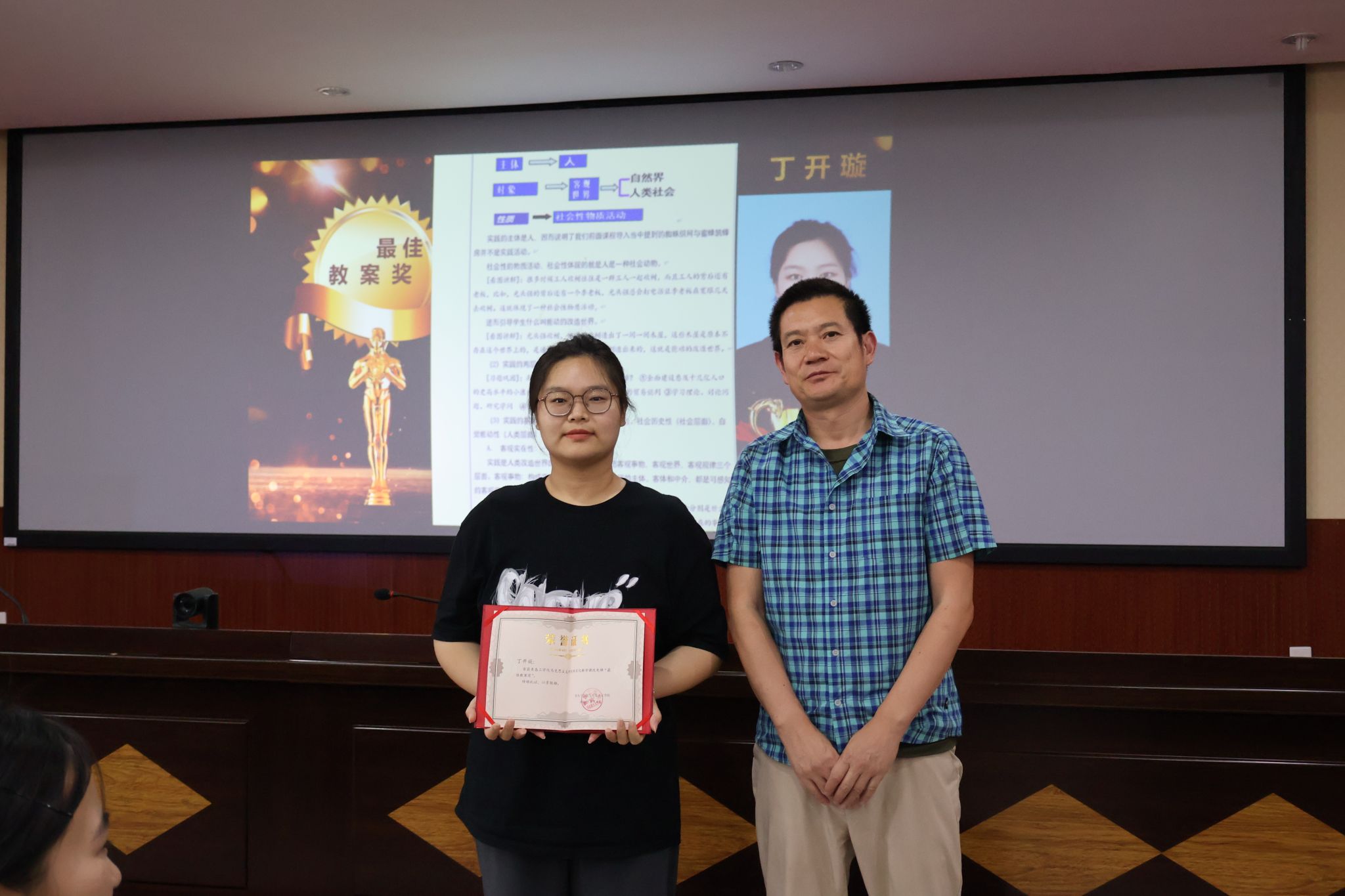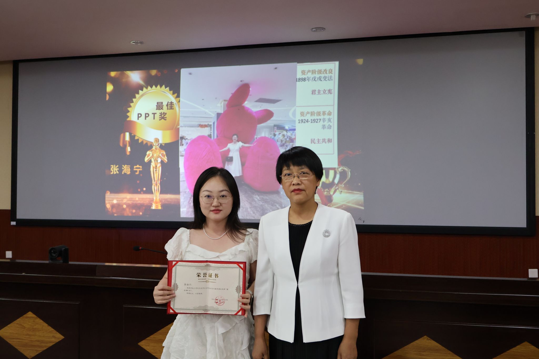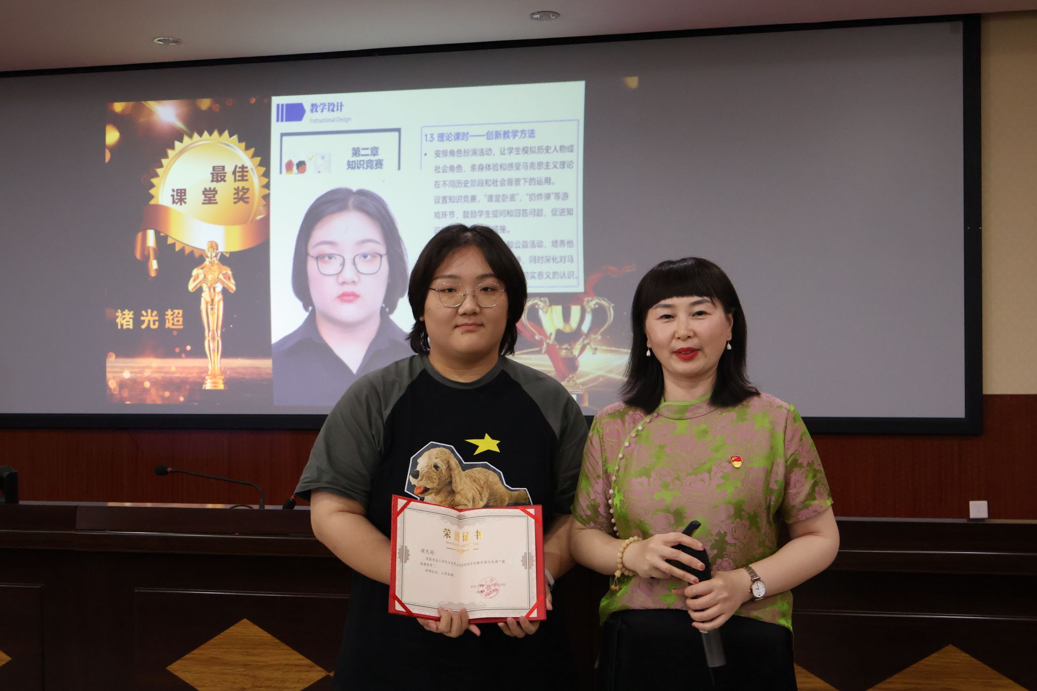 之后,大会进行“课改先锋奖”的评选环节,经过严格的申报、评审及公示程序,最终评选出一批在项目化教学改革中表现突出、成果显著的优秀教师。获奖老师分别是:最佳教案奖-丁开璇、最佳PPT奖-张海宁、最佳教学案例奖-尹萌、最佳教学创新活动奖-姚一平、最佳项目奖-张苗苗、最佳课堂奖-褚光超。各位老师通过创新课程设计、优化教学方法、强化实践教学等举措,有效推动了马克思主义理论教学的现代化、科学化和时代化进程。