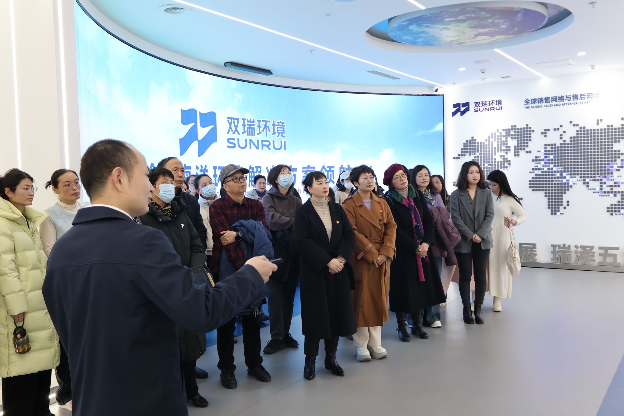 首先,教师团队共同参观企业展厅。通过全息投影、动态沙盘等数字化展陈,双瑞集团的发展历程、核心业务及“绿色智造”理念生动呈现。从船舶压载水管理系统的研发突破,到海洋腐蚀防护技术的广泛应用,企业在海洋环保领域取得的卓越成就给教师们留下深刻印象,也为后续的思政课程及课程思政中关于“创新驱动发展”“数字人工智能”“科技自立自强”等主题的教学提供生动素材。教师们在参观过程中了解到,双瑞公司自主研发多项核心技术,填补国内空白,引领行业标准,为海洋生态保护与海洋强国战略贡献力量。其船舶压载水管理系统与电解制氯产品市场占有率全球领先,展现出中国智造的非凡实力。据企业管理人员介绍,双瑞集团已累计获得国家专利400余项,主导制定行业标准20余项,产品出口至50多个国家和地区。