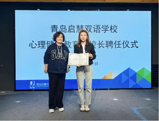 讲座开始之前,由青岛启慧双语学校副校长陈慧为程亚楠老师颁发聘任证书,陈校长表示程亚楠老师的加入将为青岛启慧双语学校的心理健康教育工作带来新的活力和专业支持。她鼓励全校师生积极参与到心理健康教育的各项活动中来,共同为学生的健康成长和学校的和谐发展作出贡献。