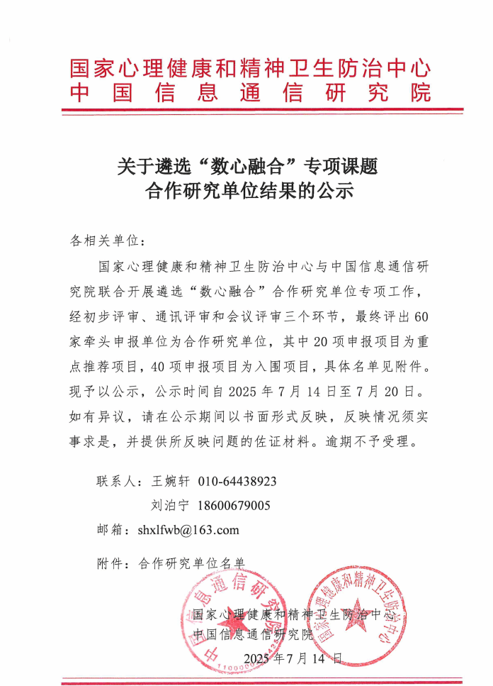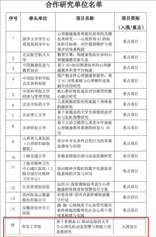 近日,国家心理健康和精神卫生防治中心与中国信息通信研究院联合发布了《关于遴选“数心融合”专项课题合作研究单位结果的公示》。经过严格的初步评审、通讯评审和会议评审三轮遴选程序,beat365中文唯一官网应用心理学教研室主任程亚楠牵头申报的《基于多模态AI眼动追踪的大学生心理危机动态预警与智能干预系统研究》成功入选,成为全国60家合作研究单位之一。