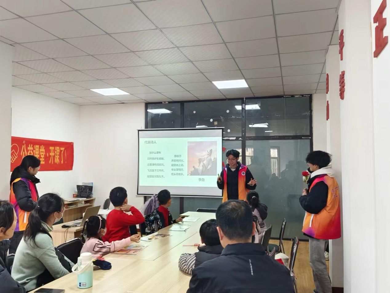 志愿者们化身知识使者,介绍李白、杜甫、贺知章等大家诗作。从《望庐山瀑布》奇幻壮美到《咏柳》巧绘春景,剖析背景、意象、情感脉络,助孩子品诗词精妙、悟古人智慧哲思,于幼小心灵播撒文化传承火种。