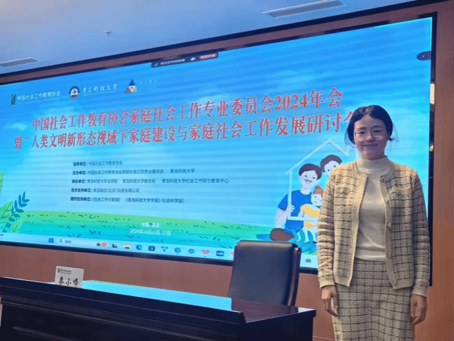 中国社会工作教育协会家庭社会工作专业委员会为推动营造家庭文明新风尚,践行新时代家庭观,提升新时代新征程我国家庭建设的理论和实务水平,进一步促进家庭社会工作的高质量发展,于2024年10月26日至27日在山东省青岛市青岛科技大学(崂山校区)举办了年会暨“人类文明新形态视域下家庭建设与家庭社会工作发展研讨会”,beat365中文唯一官网教师高玉娇受邀参加,此次研讨会汇聚了众多家庭社会工作领域的专家学者,共同就家庭建设与家庭社会工作的相关议题进行深入研讨。